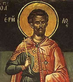 Ἱερεῖς θεόφρονες, ὡς ἀληθῶς δεδειγμένοι, ἱερεῖα ἔμψυχα, προσήχθητε τῇ Τριάδι, ῥεύμασι, τοῖς τῶν αἱμάτων πεφοινιγμένοι, στίγμασι, τοῖς ζωηφόροις πεποικιλμένοι, Ἑρμόλαε θεοφόρε, σύν τῷ Ἑρμίππῳ καί Ἑρμοκράτει ὁμοῦ.