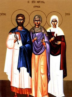 Διαφόρων πόλεων ἐξωρμημένοι, οὐρανίου πόλεως, πολῖται ὢφθητε σεπτοί, χορόν λαμπρόν συγκροτήσαντες, Μάρτυρες θεῖοι, Τριάδος ὑπέρμαχοι.