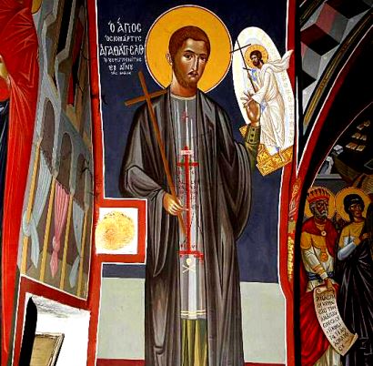 Ἀσκήσεως νάμασι, καταρδευθεῖς τήν ψυχήν, Μαρτύρων ἐξήστραψας, μαρμαρυγάς φωταυγεῖς, σοφέ Ἀγαθάγγελε· ὅθεν ἐν ἀμφοτέροις, ἀκριβῶς διαπρέψας, ᾔσχυνας τούς ἐξ Ἄγαρ, τόν Χριστόν μεγαλύνας. Αὐτόν οὖν Ὁσιομάρτυς, ἡμῖν ἱλέωσαι.