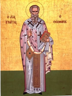 Ἅγιος Ἱερομάρτυς Ἰγνάτιος († 20 Δεκεμβρίου) ἦταν διάδοχος τῶν Ἀποστόλων καί χρημάτισε δεύτερος Ἐπίσκοπος Ἀντιοχείας. Ὑπῆρξε, μαζί μέ τόν Ἐπίσκοπο τῆς Ἐκκλησίας τῆς Σμύρνης Πολύκαρπο, μαθητής τοῦ Εὐαγγελιστοῦ Ἰωάννου τοῦ Θεολόγου. Μαρτύρησε ἐπί αὐτοκράτορα Τραϊανοῦ (98 – 117 μ.Χ.) στή Ρώμη, κατασπαραχθείς ἀπό τά θηρία.