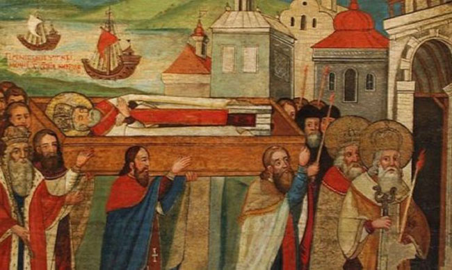 Κατά τήν συναξαριστική παράδοση τό ἅγιο λείψανο ἀνεχώρησε τήν 1η Ἀπριλίου τοῦ 1087 καί ἔφθασε στό Μπάρι στίς 20 Μαΐου.