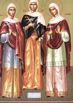 Ὡς αὐτάδελφοι Κόραι καί οὐρανόφρονες, πρός εὐσεβείας ἀγῶνας ὁμονοοῦσαι καλῶς, τόν ἀρχέκακον ἐχθρόν κατεπαλαίσατε, Χιονία ἡ σεμνή, σύν Ἀγάπῃ τῇ κλυτῇ, Εἰρήνη ἡ πανολβία. Καί νῦν Χριστόν δυσωπεῖτε, ἐλεηθῆναι τάς ψυχάς ἡμῶν.