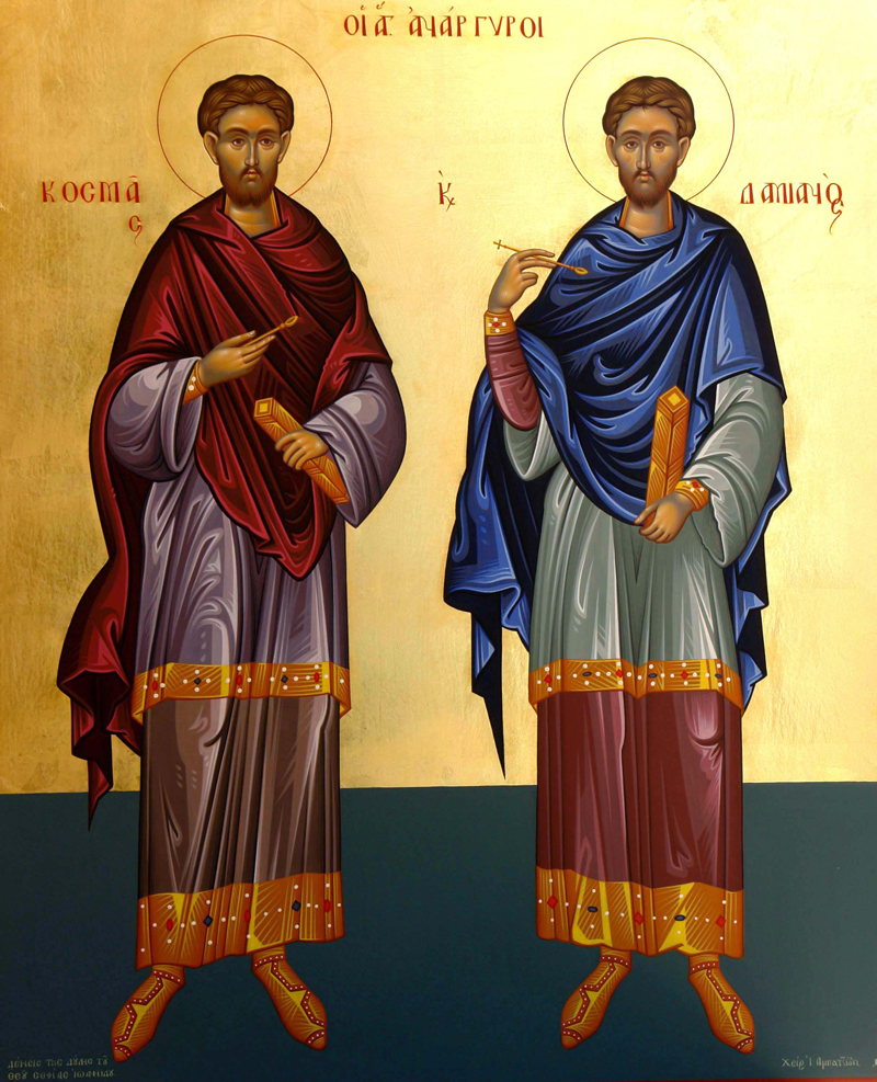 ἱ Ἅγιοι Ἀνάργυροι Κοσμᾶς καὶ Δαμιανός, οἱ ὁποῖοι ἔζησαν τὴν ἐποχὴ ποὺ αὐτοκράτορας τῶν Ρωμαίων ἦταν ὁ Καρίνος, ἦταν γιατροὶ στὸ ἐπάγγελμα καὶ παρεῖχαν ἰάσεις σὲ ὅλους ὅσους εἶχαν ἀνάγκη, καὶ γιὰ ἀντάλλαγμα δὲν ἔπαιρναν χρήματα, ἀλλὰ τὸ μόνο ποὺ ζητοῦσαν ἦταν νὰ πιστέψουν στὸν Χριστό. Κάποιοι ὅμως καλοθελητὲς διέβαλαν τοὺς ἁγίους στὸν αὐτοκράτορα καὶ τοῦ εἶπαν ὅτι οἱ θεραπεῖες καὶ τὰ θαύματα ποὺ ἐπιτελοῦσαν τὰ ἔκαναν μὲ μαγικὲς τέχνες.