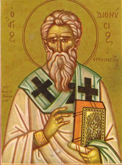 Τῶν ὑπερκοσμίων θεωριῶν, γεγονώς ἐπόπτης, καί ἐκφάντωρ θεοειδής, θεαρχικωτάτων, ἐλλάμψεων τό κάλλος, πανσόφως διαγραφείς, ὦ Διονύσιε.