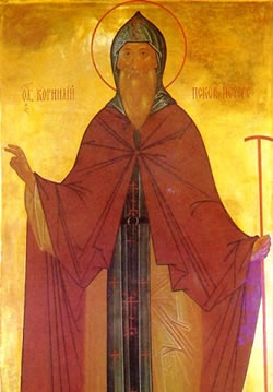 Ἅγιος Ἱερομάρτυς Κορνήλιος γεννήθηκε τό ἔτος 1501 στή Ρωσία ἀπό εὔπορη καί εὐγενή οἰκογένεια. Ἔλαβε τήν ἐκπαίδευσή του κοντά σέ ἕνα γέροντα μοναχό στή μονή Μιρόζ τοῦ Πσκώφ, στήν ὁποία τόν ἀπέστειλαν οἱ εὐσεβεῖς γονεῖς του.Μετά τό πέρας τῶν σπουδῶν του ἀποφάσισε νά ἀκολουθήσει τήν ὁδό τῆς μοναχικῆς πολιτείας καί νά γίνει μοναχός. Τήν ἀπόφασή του αὐτή πραγματοποίησε, μέ τή Χάρη τοῦ Θεοῦ, ὅταν ἐπισκέφθηκε τήν Μονή τῶν Σπηλαίων τοῦ Πσκώφ καί ἐντυπωσιάσθηκε ἀπό τήν κατανυκτικότητα τῶν ἱερῶν Ἀκολουθιῶν καί τό κάλλος τῆς φύσεως.