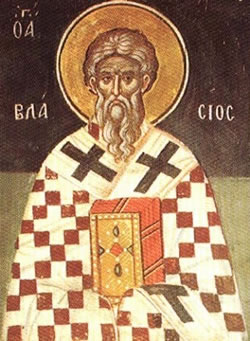 Ἅγιος Μάρτυς Βλάσιος καταγόταν ἀπό τήν Καισάρεια τῆς Καππαδοκίας καί γεννήθηκε ἀπό πλούσιους καί φιλάνθρωπους γονεῖς. Οἱ ἐπαγγελματικές ἀνάγκες τῆς οἰκογένειάς του τόν ἀνάγκασαν νά ἀπομακρυνθεῖ γιά λίγο ἀπό τήν Καισάρεια. Ὅταν ἔγινε διωγμός ἐναντίον τῶν Χριστιανῶν, οἱ εἰδωλολάτρες τόν καταζητοῦσαν ὡς Χριστιανό, ἀλλά δέν τόν εὕρισκαν. Ἡ μητέρα του, πού ποθοῦσε τή σωτηρία του, τοῦ συνέστησε νά ἀκολουθήσει τόν δρόμο τῆς φυγῆς. Ἀλλά ὁ Ἅγιος ἀρνήθηκε. Τόσοι ἄλλοι μαρτυροῦσαν. Γιατί, λοιπόν, αὐτός νά δραπετεύσει; Ἔτσι, προσῆλθε μέ προθυμία καί παραδόθηκε στούς διῶκτες του, τούς ὁποίους καί φιλοξένησε καί περιποιήθηκε σάν νά ἦταν εὐεργέτες του.