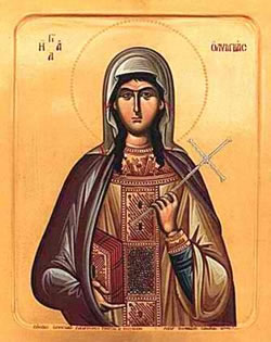 Χαίροις ἡ Ὁσία Ὀλυμπιάς, ἐναρέτων ἔργων, ὑποτύπωσις ἀληθής· χαίροις ἡ τῶν ἄθλων, καί τῆς ἁγίας δόξης, τῷ θείῳ Χρυσοστόμῳ συγκοινωνήσασα.